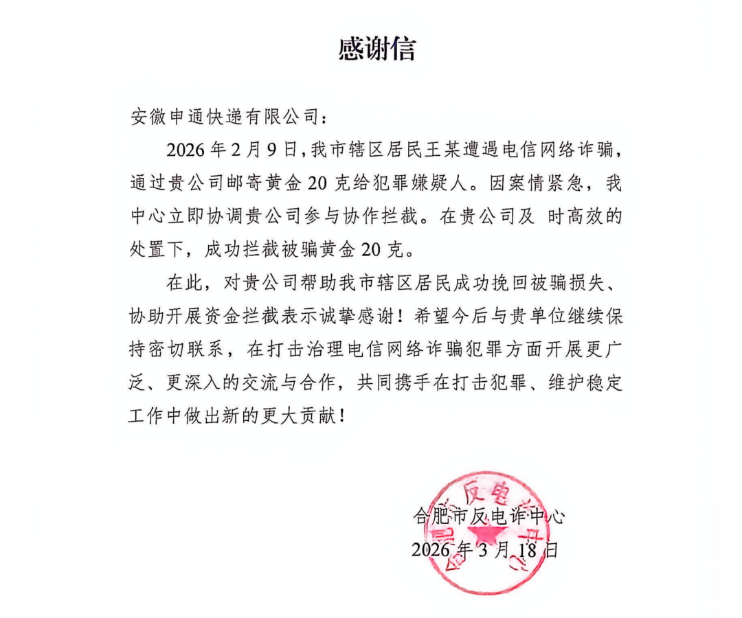2月9日上午9时,申通快递安徽省公司安全部接到合肥市反诈中心紧急通报:一票从合肥寄出的快件疑似涉及电信网络诈骗,内件夹带20克黄金,需立即拦截。